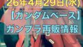 ガンダムベース再販情報 26年4月25日(土)【ガンダムベース】ガンプラ再販情報 (26年4月25日更新)26年4月25日(土)に【ガンダムベース】新千歳空港店にて、RG 1/144 ガンダムベース限定 Hi-νガンダム[チタニウムフィニッシュ]やRG 1/144 サザビー [クリアカラー]などの限定キットが多数入荷しました!また【ガンダムベース】東京店ではMGSD ガンダムベース限定 フリーダムガンダム [クリアカラー]などの限定キットが入荷しました♪ガンプラ再販品(一般発売品)はMG ジンクスやMG フルアーマーZZガンダム Ver.Kaが再入荷しました✨※他キットや他店舗での入荷がわかりしだい、随時追記する予定です 2026.04.25 2026.04.28 ガンダムベース再販情報